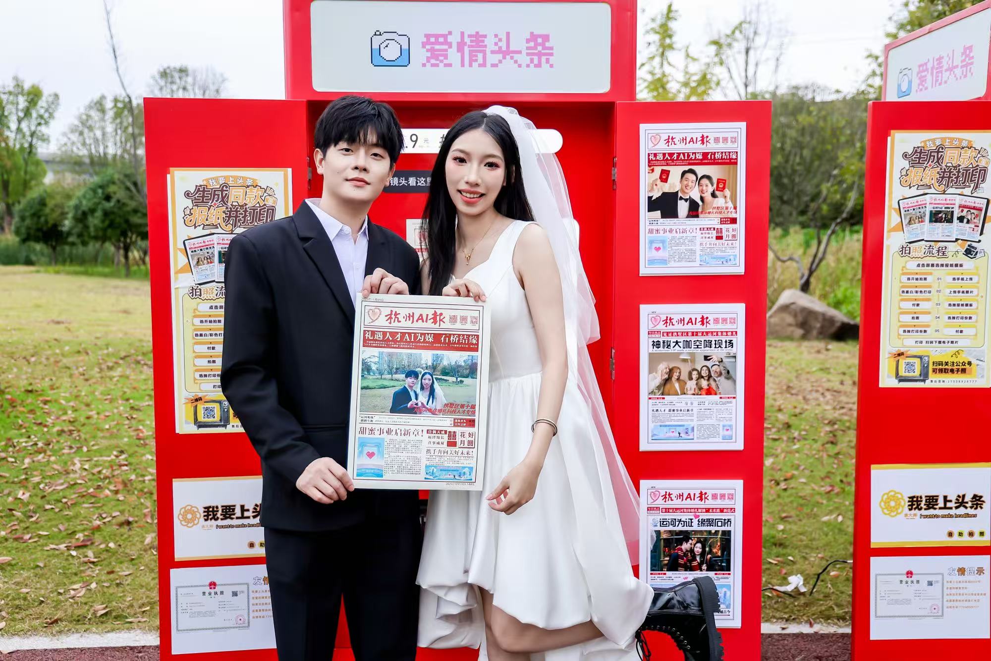 现场“石全十美”运河市集成为人气汇聚场。科技体验区、心动信号站、非遗互动区与甜蜜助力区四大主题板块联袂亮相。丝绸扎染、锦灰堆拓、非遗剪纸等十几个展示石桥悠久文化底蕴的展位依次排开,辖区内高新企业带来的互动项目则让人眼前一亮。其中,两大打卡点备受追捧:AI报纸机即时生成刊载着新人甜蜜照片的“爱情头条”,成为最具个人色彩的纪念品;声音邮局则让爱侣们录下想说给彼此的“蜜语”,将此刻的浓情化为可留存、可回味的声波档案。