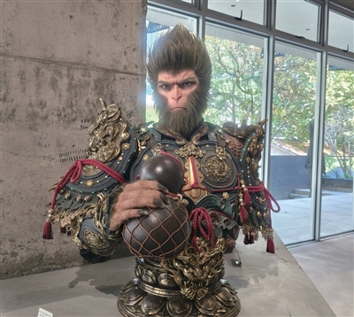 推开零售店的玻璃门,耳畔是游戏的经典配乐,眼前是浓郁的国风美学,顾客完成的是一次从现实到幻想世界的场景穿越。钟馗骑虎雕像威严矗立,成为店内当之无愧的视觉焦点。自今年8月“钟馗”成为《黑神话》系列第二部作品的主角后,这位新“天命人”的关注度便持续攀升。约1000平方米的店铺空间,巧妙地采用了“展陈穿插商品”的陈列方式——悟空半身像、灵吉菩萨头像、杨戬、牛魔王等角色雕像不仅是珍贵的展品,还是引导动线的空间地标。“有种自己穿越到了游戏世界的感觉。”游客王先生说。