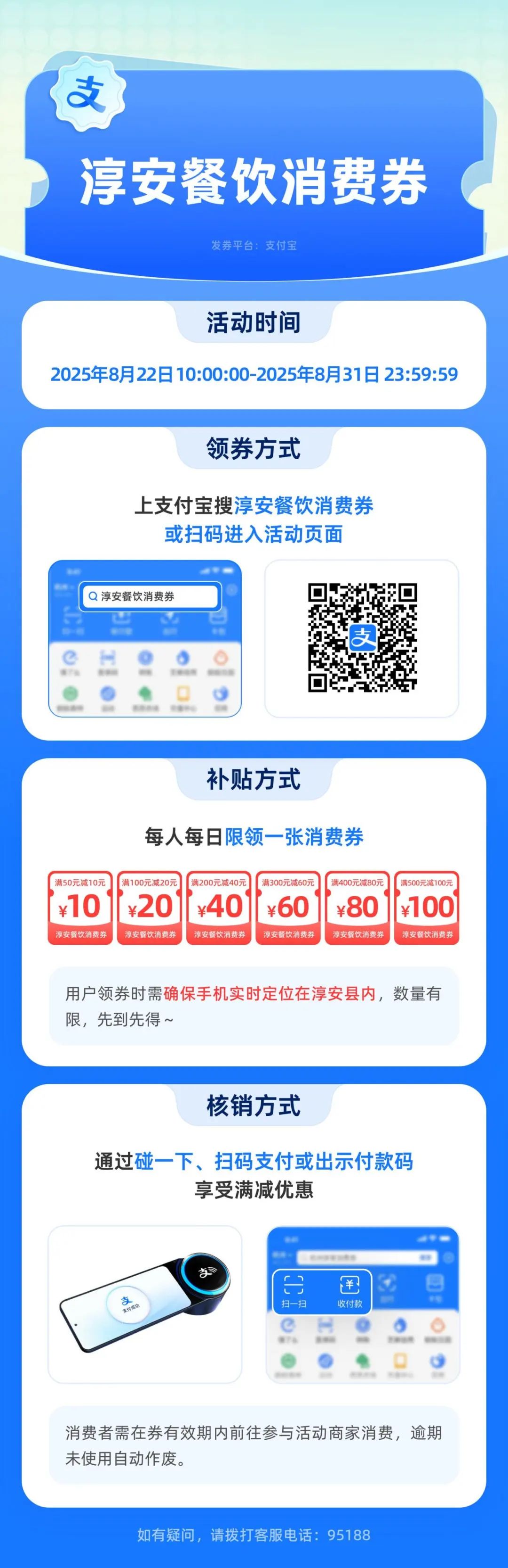 2.所有来淳安消费的支付宝实名用户均可参与抢券,领券时需确保【手机定位在淳安县内】。