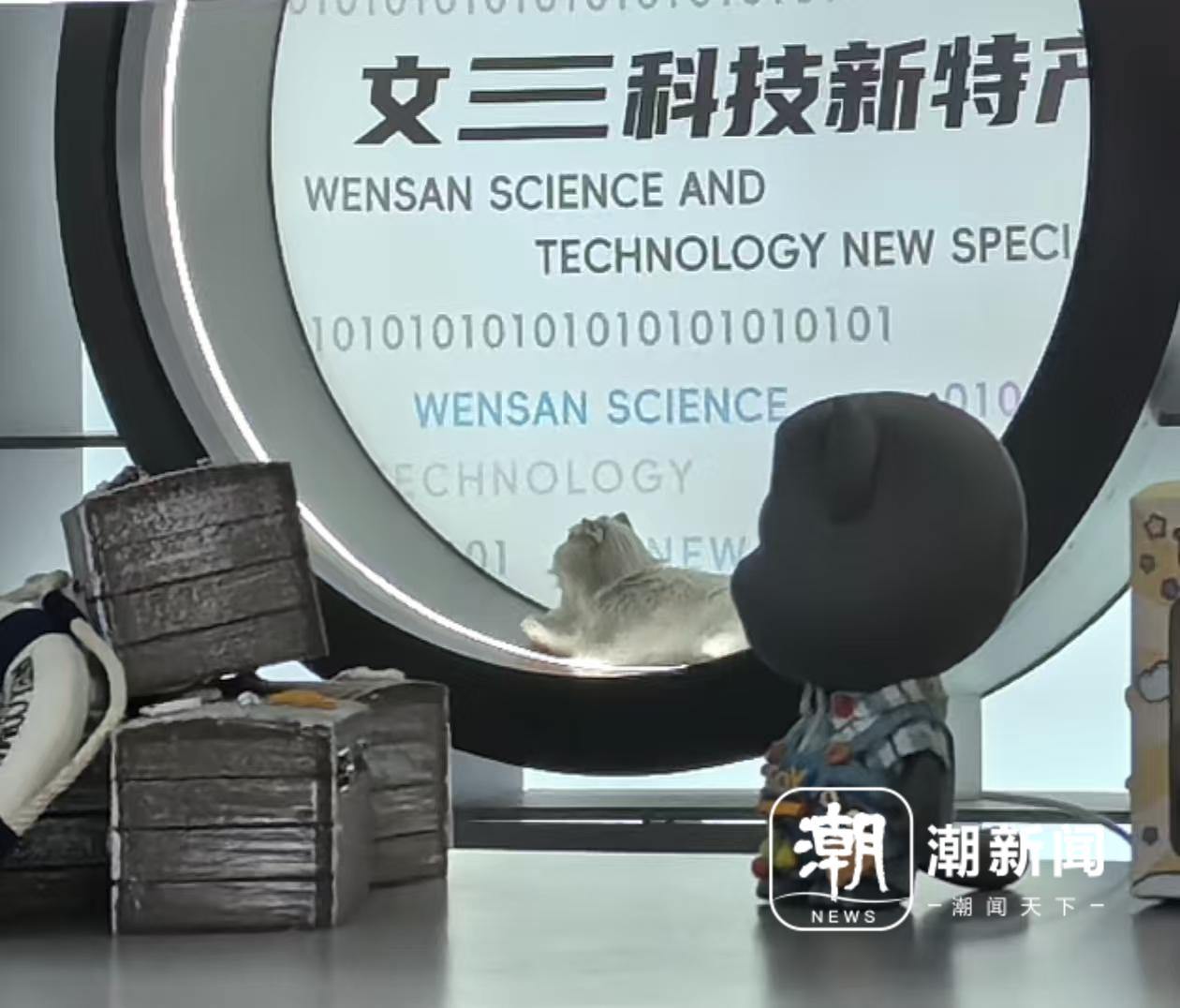 现场,他抚摸着一款仿真猫咪宠物机器人。猫咪移动头尾并发出了喵喵叫,这让他惊喜,“原来在杭州还能实现赛博养猫。”