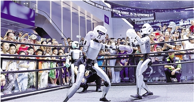 今年9月,第四届全球数字贸易博览会在杭州举办。图为宇树科技人形机器人在擂台上“打拳击”。