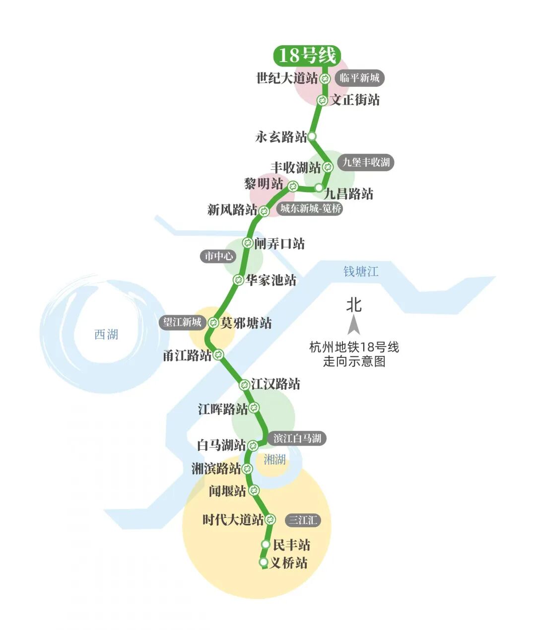 而拥有“南北快线”之名的地铁18号线,起于萧山区义桥站,止于临平区世纪大道站,是穿越中心城区的南北向轨道快线,建成后将与19号线形成十字快线网络,同时将实现与海宁、诸暨、桐乡方向市城(郊)铁路的互联互通,长约48千米,设站19座。
