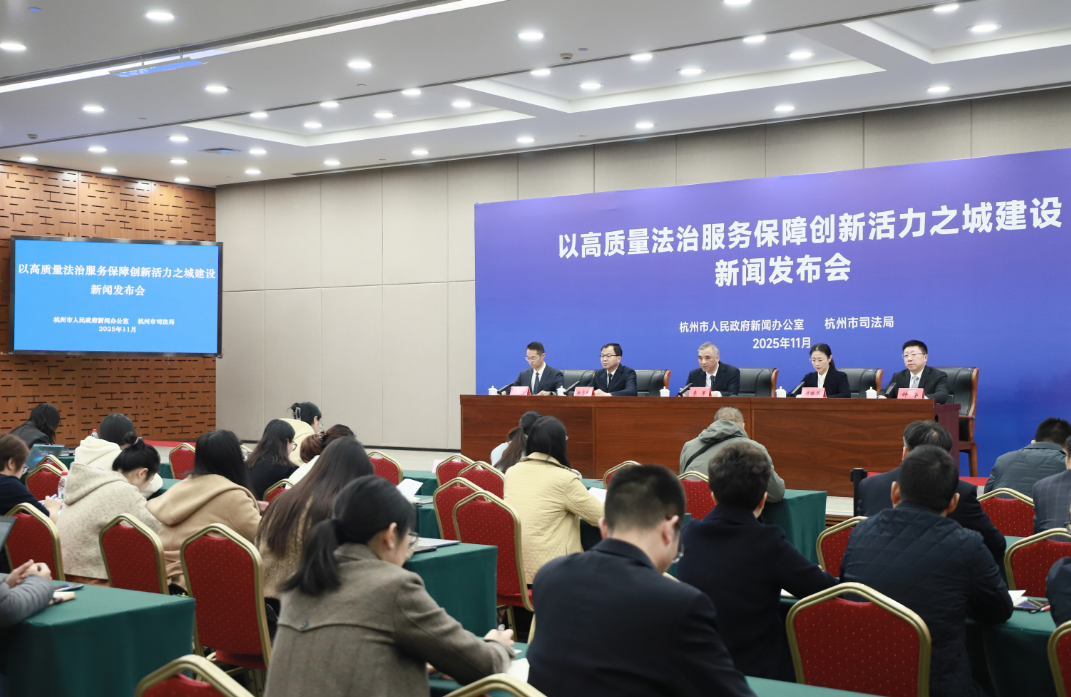 11月25日上午,杭州市政府新闻办联合杭州市司法局,召开以高质量法治服务保障创新活力之城建设新闻发布会,并系统介绍了高质量法治服务保障工作的有关情况。