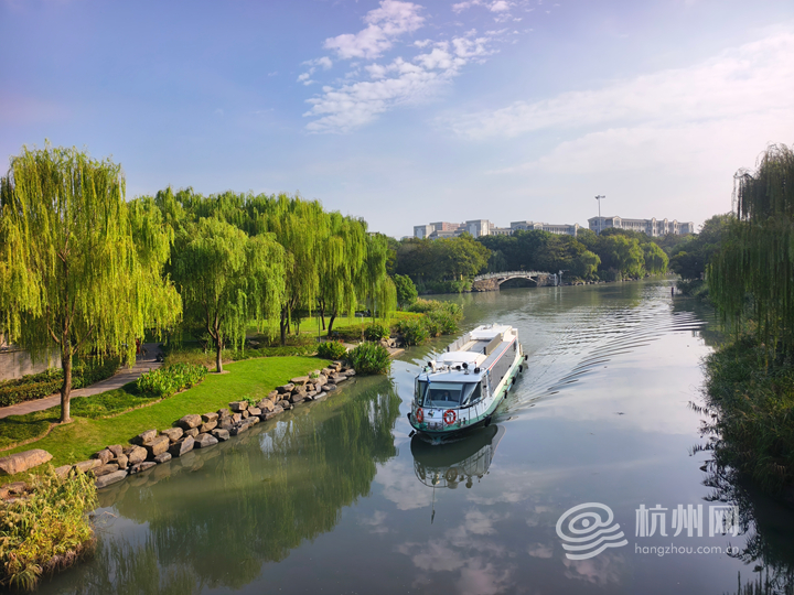 想换个角度闻桂香,就去坐余杭塘河信义坊——杨家桥段水上巴士。三块钱的船票,就能在河面上开启一段“桂香之旅”。河岸边,两列桂花树如仪仗般整齐排列,将静谧与悠闲“锁”在河道旁,随着船慢慢开,我们看到余杭塘河如今兼具岁月沉淀与现代文明的模样,河岸既有带着复古韵味的亭子码头,也有设计简约的现代化亲水平台;沿途更有断断续续的廊架、廊桥、廊亭,温润的木质感串联起河景,让整个河岸既有历史的厚重感,又不失当下的舒适与灵动。