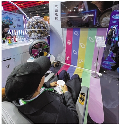 专注于数字气味技术研发与应用的气味王国带来的展品是一款“气味电视”,它搭载了一台“气味打印机”,依托气味数字化技术,能实时解析画面内容,在0.1-0.2秒内同步释放对应气味。展台前,排队等待体验的观众络绎不绝。画面上,一颗颗巧克力滚滚而来,散发着诱人的香气,一名观众看着说:“好想咬一口啊!”