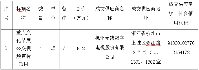 杭州市文化创意产业发展中心(杭州市动漫游戏产业发展中心)重点文化节展公交视频宣传项目的成交结果公告
