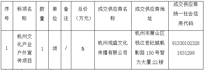 杭州市文化创意产业发展中心(杭州市动漫游戏产业发展中心)杭州文化产业户外宣传项目的成交结果公告