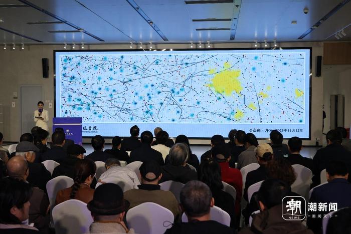 在浙江版画院的开院仪式上,首幅数字版画第一印“众迹·序”的生成备受全场瞩目。自观众步入展厅起,行走轨迹便被实时捕捉。流动的线条与交错的点位在数字画布上不断延展、叠合,逐渐汇聚成一幅独具特色的动态版画。这幅由公众共同参与创作的艺术图像,不仅展现了版画艺术的当代创新,也标志着这座艺术殿堂正式开启与公众共创、共享的新征程。